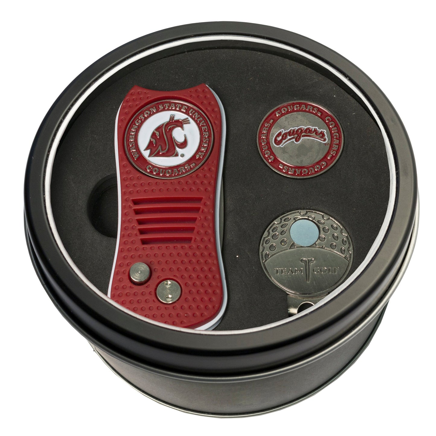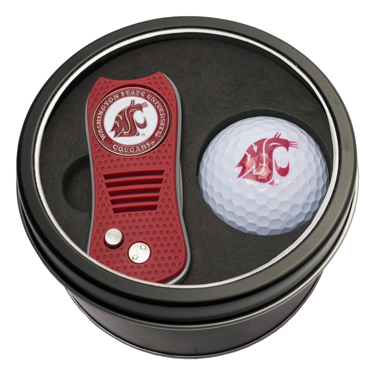 - Golf Ball Tin includes switchblade style retractable divot tool with double-sided magnetic ball marker, 1 logo golf ball