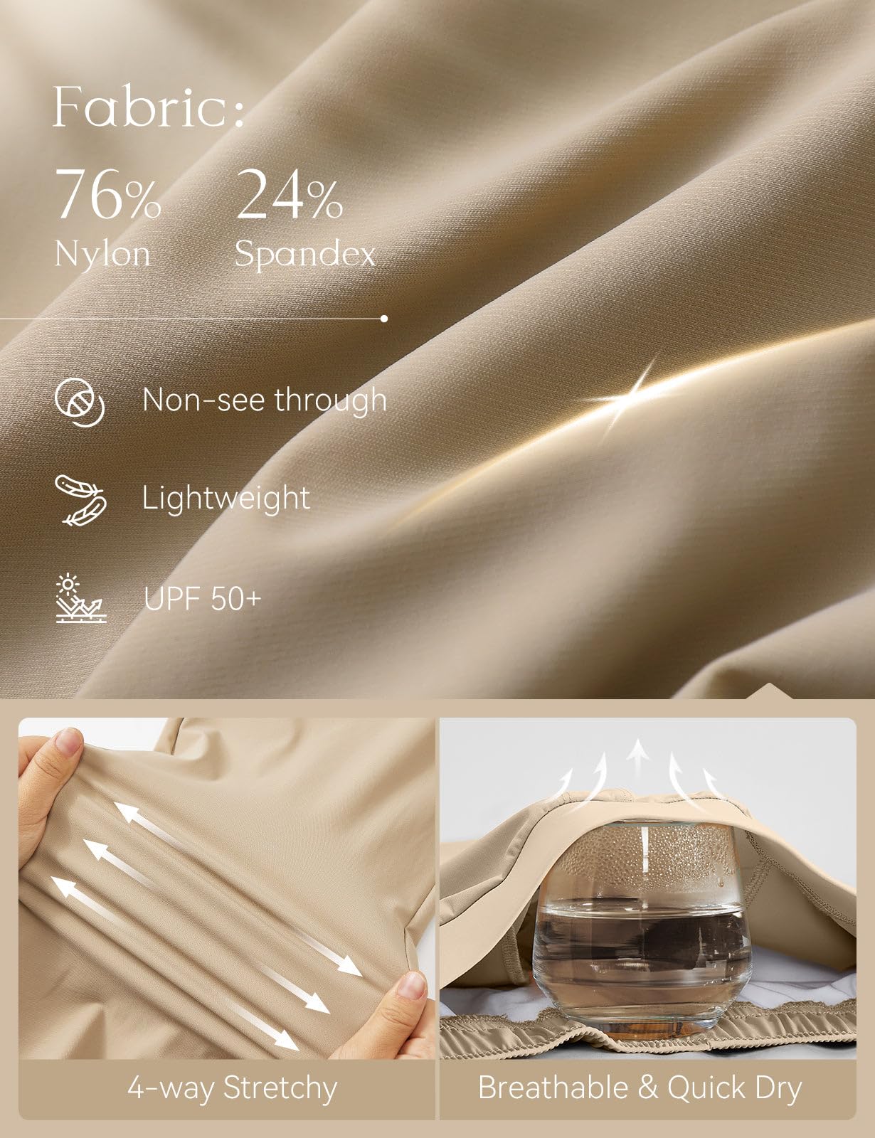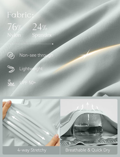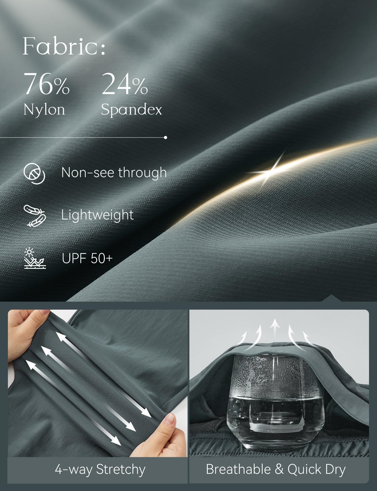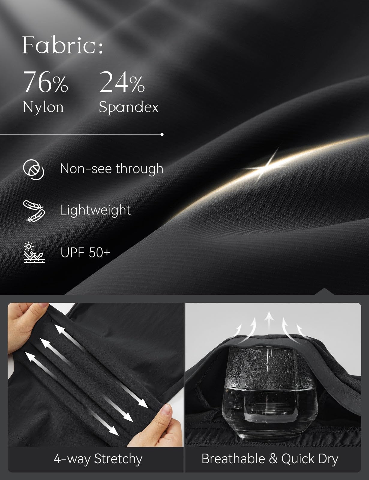 - Stretchy Fabric: This fabric offers excellent elasticity, durability,quick dry, lightweight , moisture-wicking, and UPF 50+ protection.