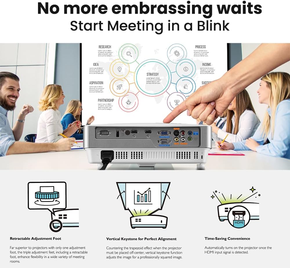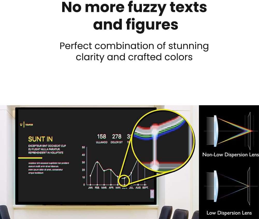 - BIG PICTURE IN SMALL SPACES – 0. 9 Short throw lens design prevents you from getting blinded by light when giving presentations.