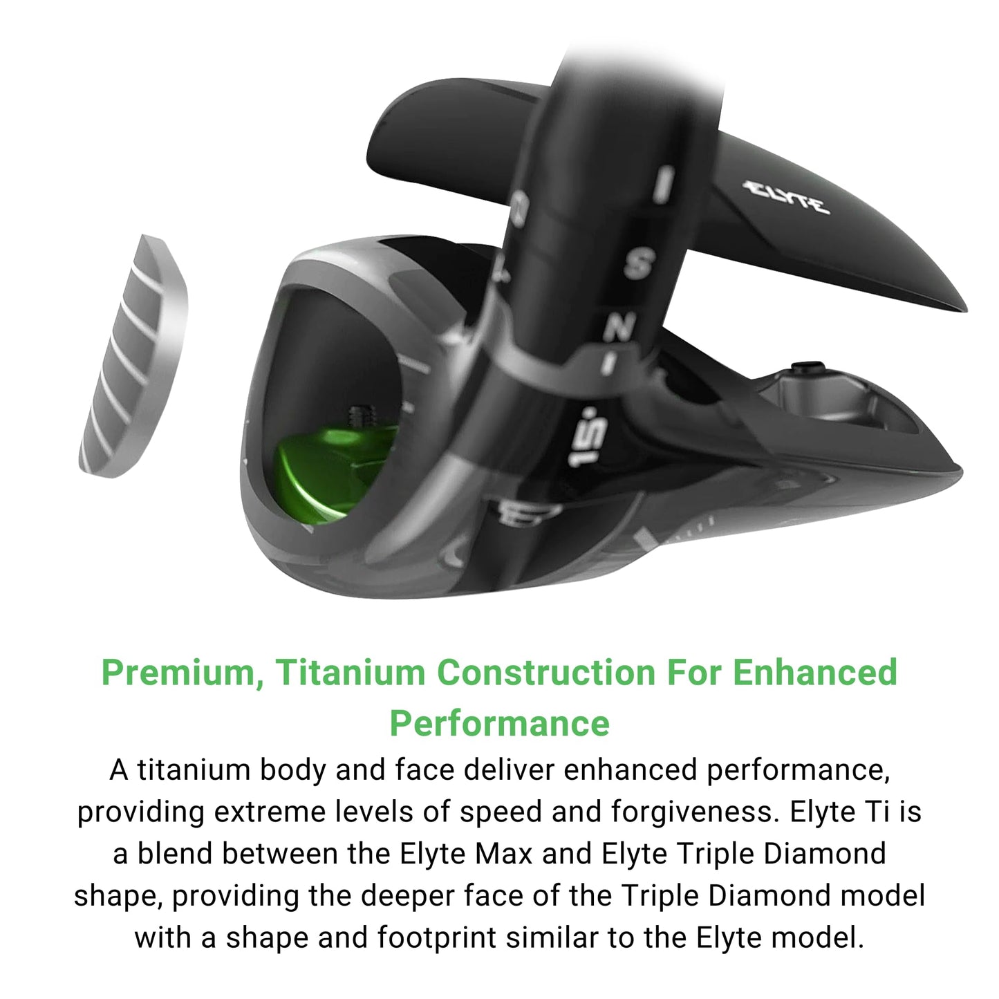 • Premium, Titanium Construction For Enhanced Performance. A titanium body and face deliver enhanced performance, providing extreme levels of speed and forgiveness. Elyte Ti is a blend between the Elyte Max and Elyte Triple Diamond shape, providing the deeper face of the Triple Diamond model with a shape and footprint similar to the Elyte model. An interchangeable weighting system allows players to toggle back and forth between lower spin with a penetrating ball flight or more forgiveness.