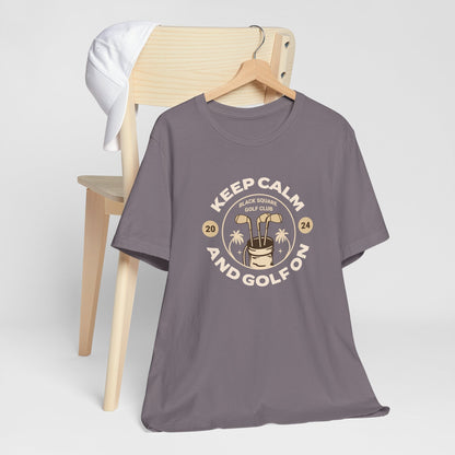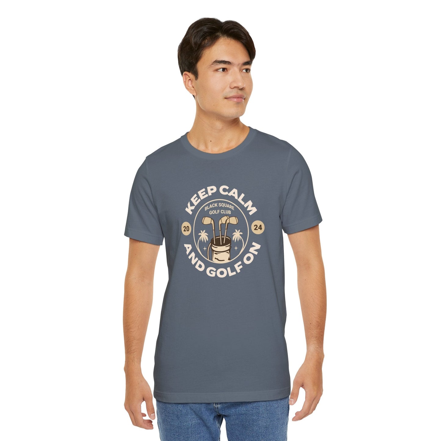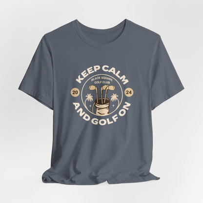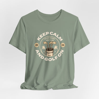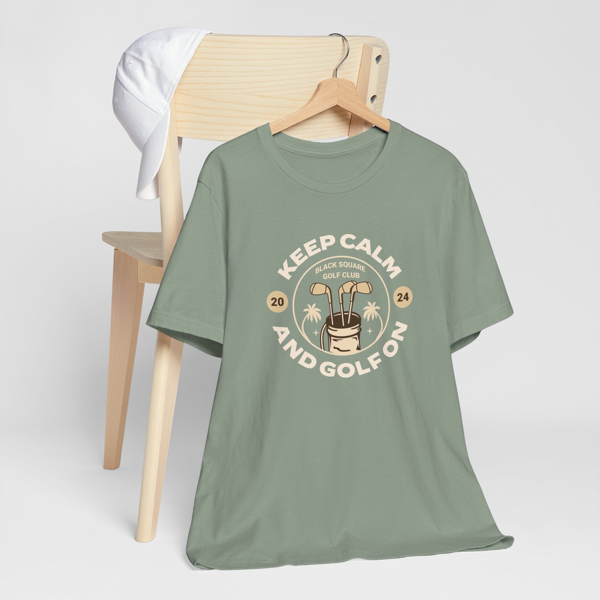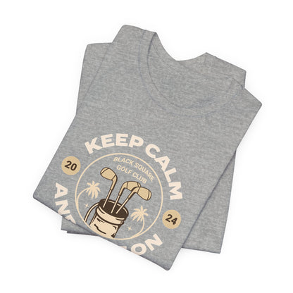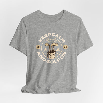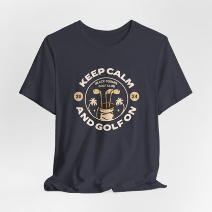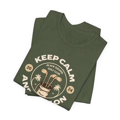 A unisex jersey short sleeve tee featuring a Keep Calm design, perfect for golf enthusiasts or those who enjoy a sporty and adventurous vibe. This tee is made with 100% lightweight cotton, perfect for layering and breathability. The retail fit and crew neckline make it versatile for casual and semi-formal settings, ideal for accessorizing. Relevant for sports events, casual outings, or as a unique gift for golf lovers.