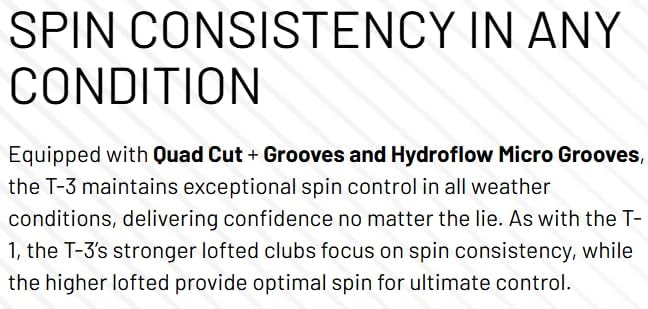 - Quad Cut Grooves: Milled narrow/deep grooves optimized for stronger lofts and wide/shallow grooves optimized for higher lofts