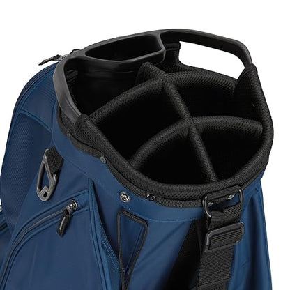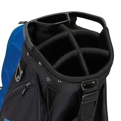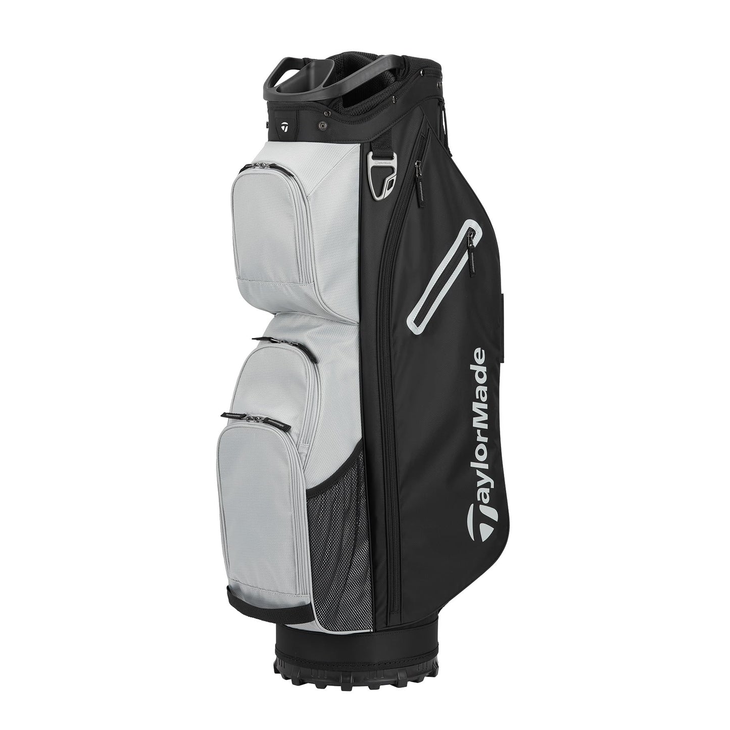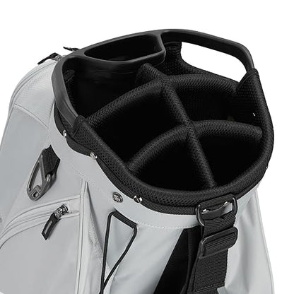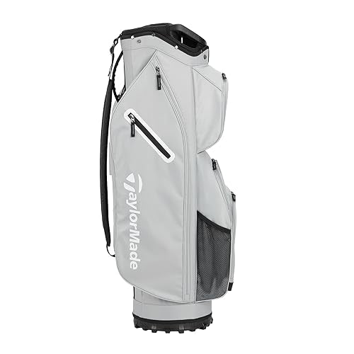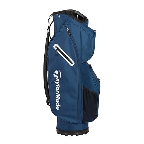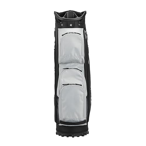 The TaylorMade Classic Cart golf bag has 15 individual full bag length club dividers, additional front-facing pockets for easier access and more storage, a new fade-resistent yarn dyed fabric that holds color longer with UV-protected materials, a built-in putter protecting polymer patch, a magnetic stash pocket, an oversized cooler pocket, and a split-side apparel pocket for more separation.