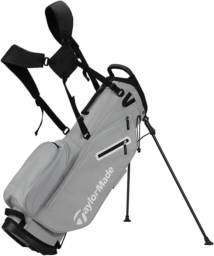 The TaylorMade Classic Stand golf bag has 15 individual full bag length club dividers, additional front-facing pockets for easier access and more storage, a new fade-resistent yarn dyed fabric that holds color longer with UV-protected materials, a built-in putter protecting polymer patch, a magnetic stash pocket, an oversized cooler pocket, and a split-side apparel pocket for more separation.