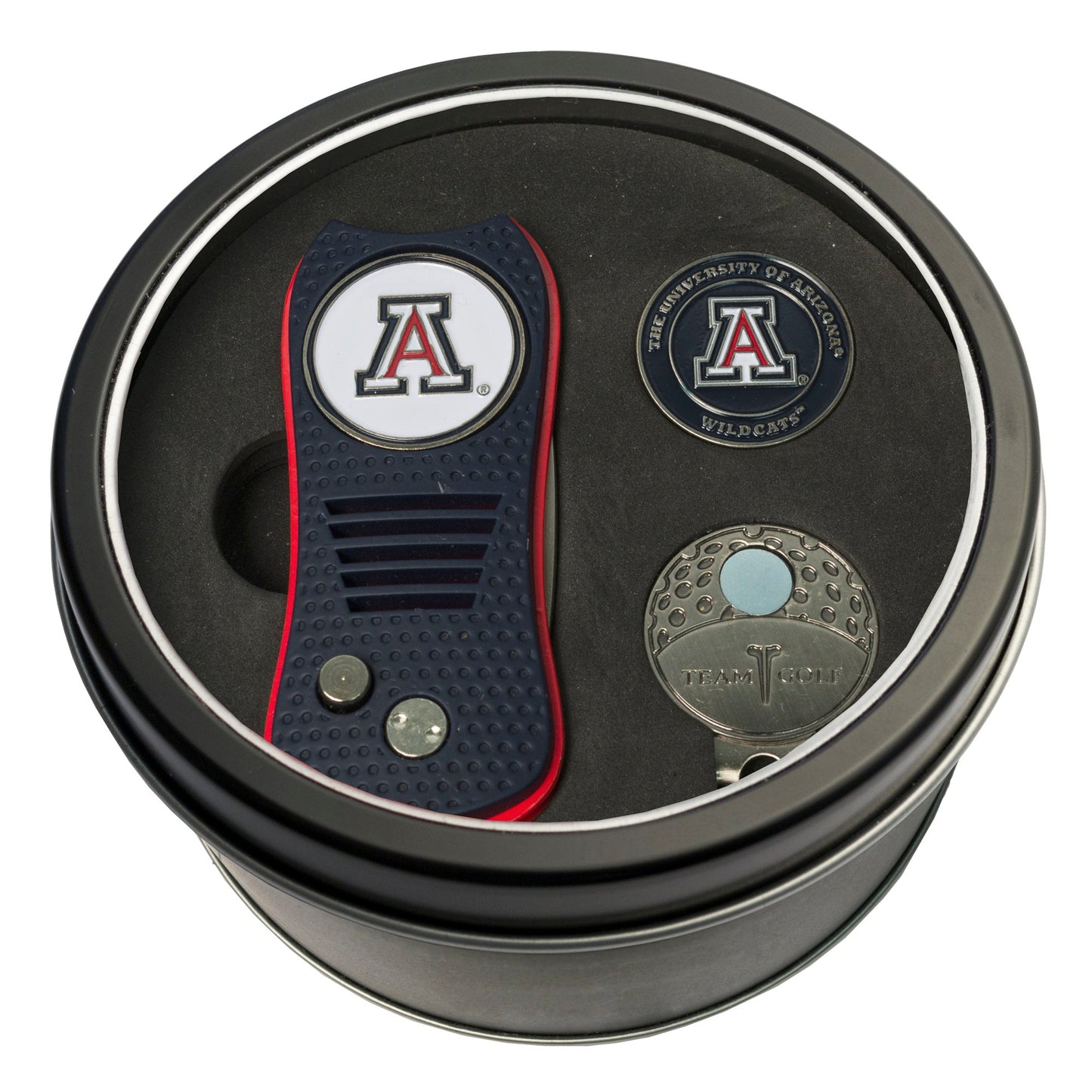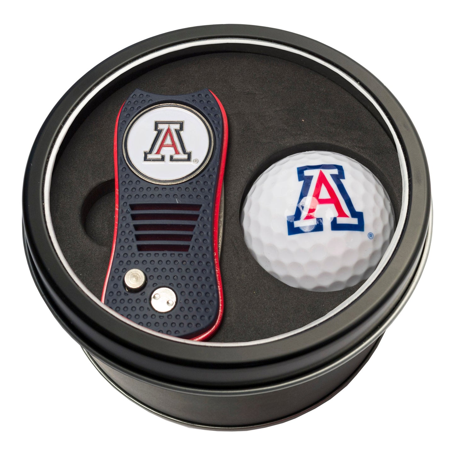 - Golf Ball Tin includes switchblade style retractable divot tool with double-sided magnetic ball marker, 1 logo golf ball