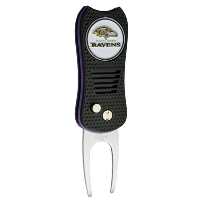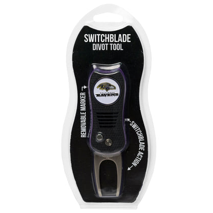 Switchblade Divot Tool features a unique and patented lightweight aluminum double prong design which causes less damage to greens, a soft grooved handle for easy gripping and a removable double-sided enamel fill ball marker.