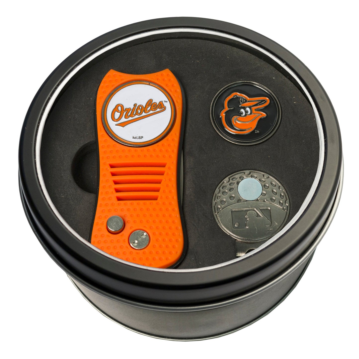 - Golf Ball Tin includes switchblade style retractable divot tool with double-sided magnetic ball marker, 1 logo golf ball