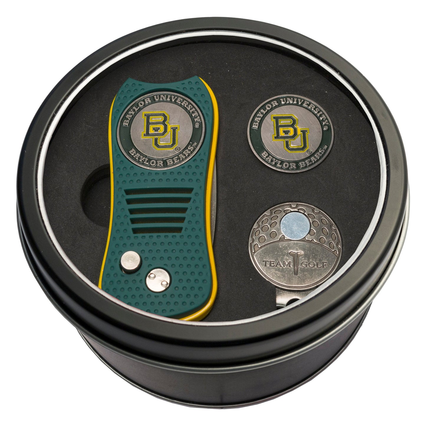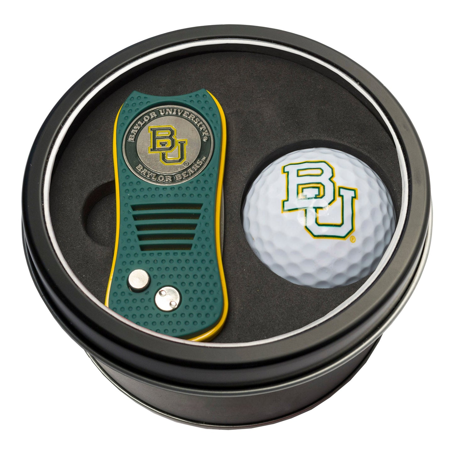 - Golf Ball Tin includes switchblade style retractable divot tool with double-sided magnetic ball marker, 1 logo golf ball