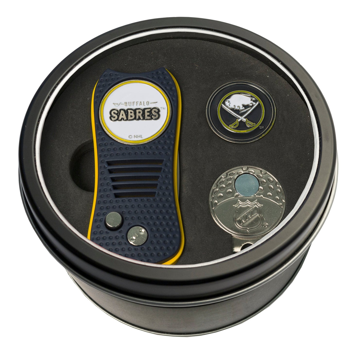 - Golf Ball Tin includes switchblade style retractable divot tool with double-sided magnetic ball marker, 1 logo golf ball