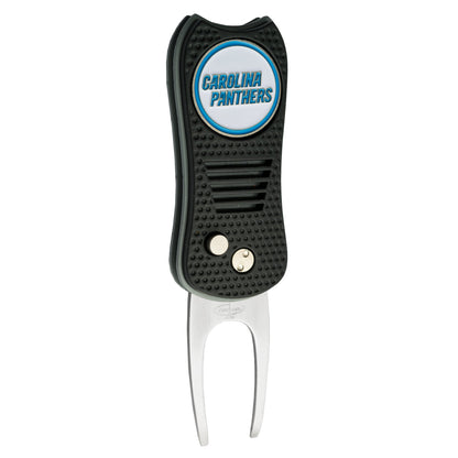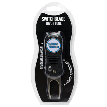 Switchblade Divot Tool features a unique and patented lightweight aluminum double prong design which causes less damage to greens, a soft grooved handle for easy gripping and a removable double-sided enamel fill ball marker.