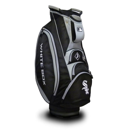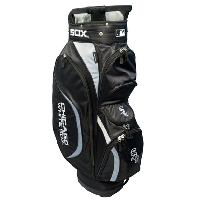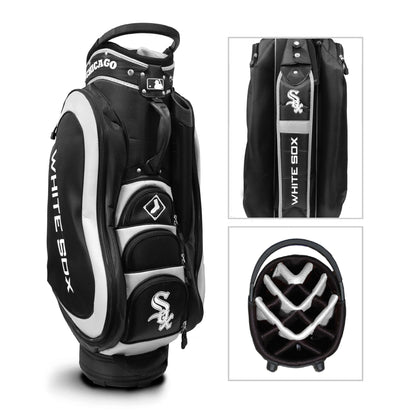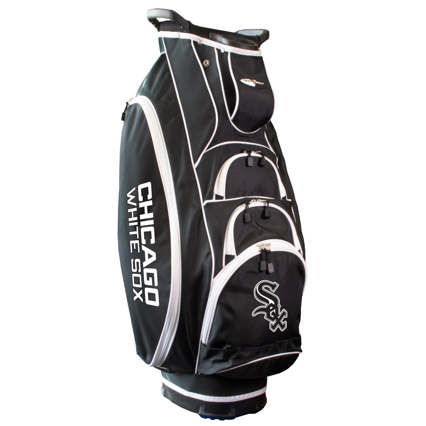 This cart bag features 10-way full length dividers, 3 bottom compartments, an oversized putter well, padded straps, removable rain hood, towel ring and umbrella holder; It comes with five zippered pockets; One to hold valuables and another cooler pocket to store drinks.