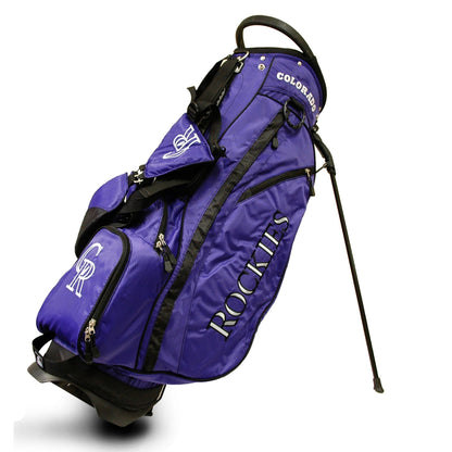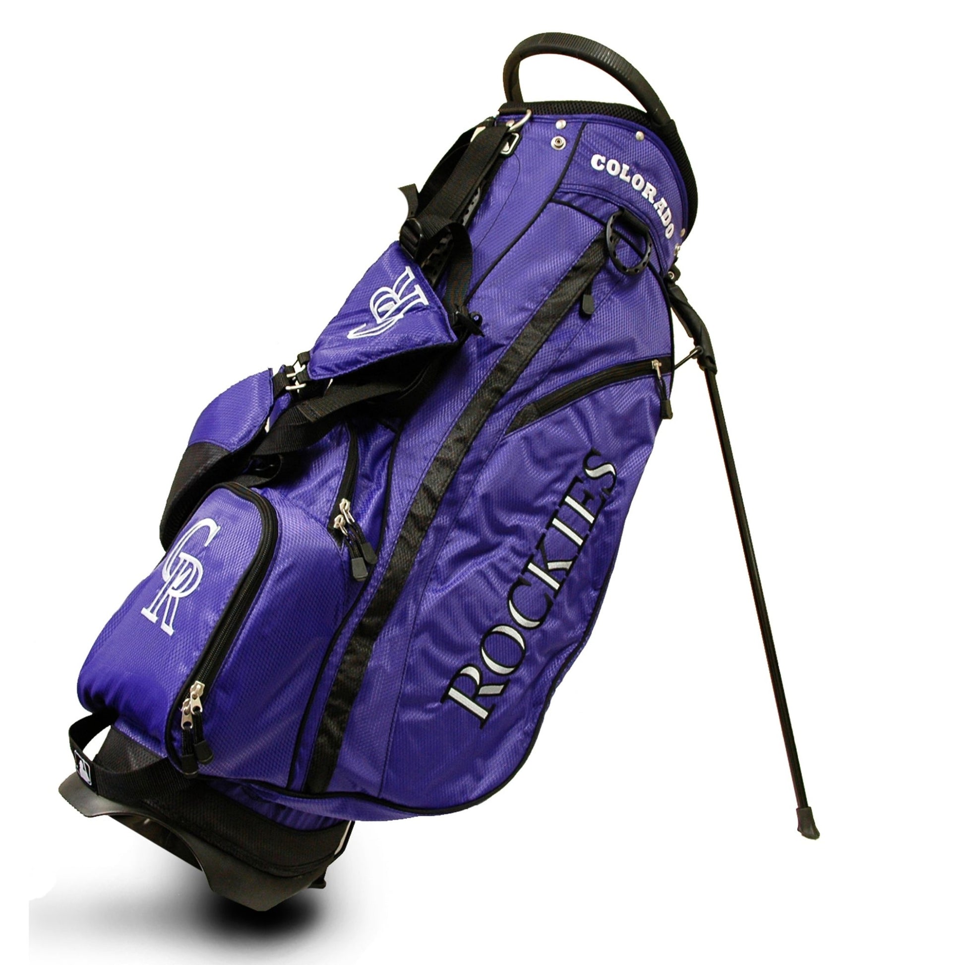 This stand bag features 14-way full length dividers, integrated top handle, & 2 lift assist handles, five zippered pockets, fleece lined valuable pouch, & cooler pocket, spring action stand, removable rain hood, umbrella holder, towel ring, & heavy duty nylon construction.