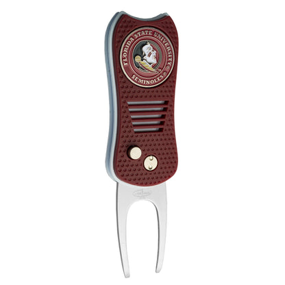 Switchblade Divot Tool features a unique and patented lightweight aluminum double prong design which causes less damage to greens, a soft grooved handle for easy gripping and a removable double-sided enamel fill ball marker.