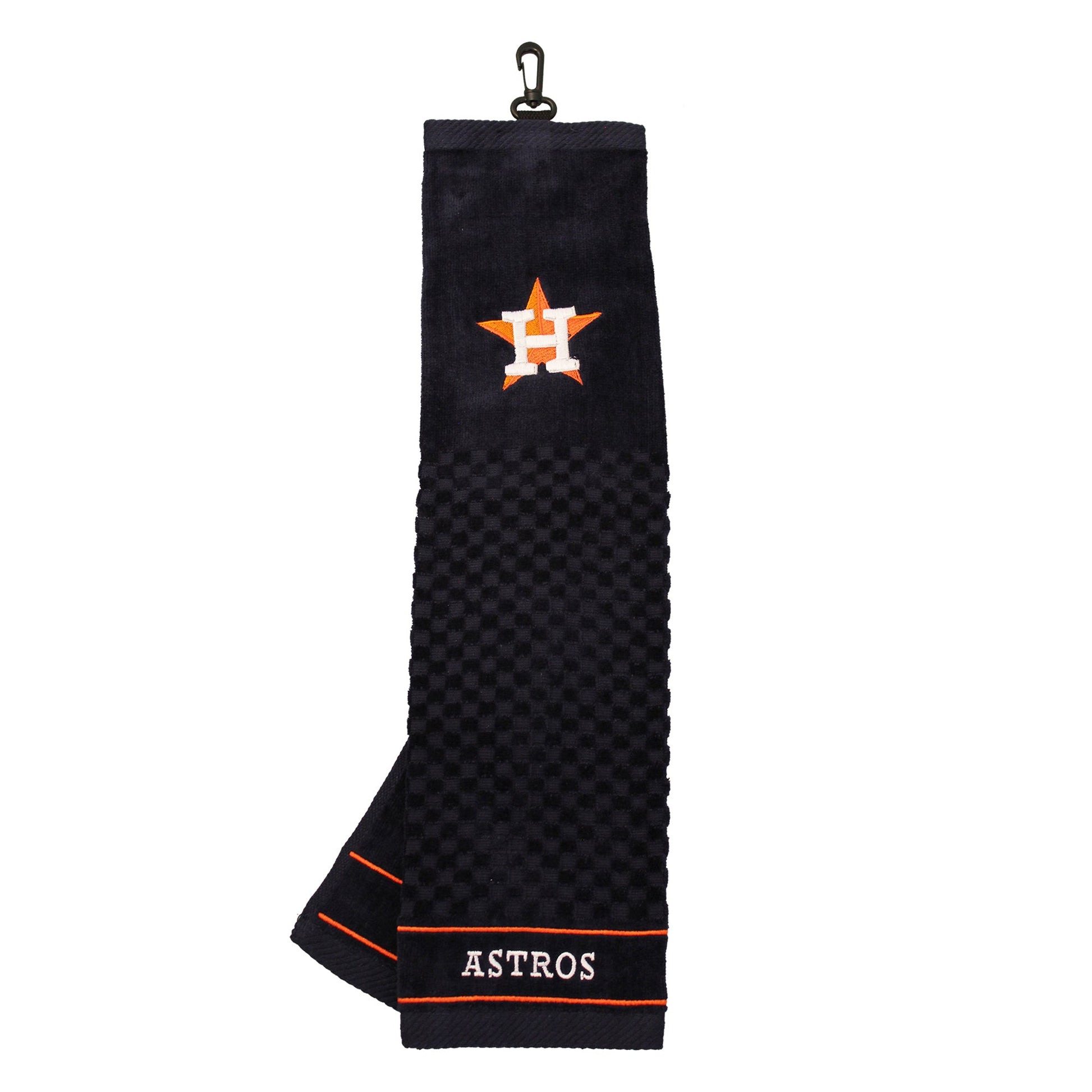 Tri-Fold 16" x 22" towel features a checkered scrubber design for easier cleaning, swivel clip for easy attachment and removal from golf bags and a full color embroidered logo. 100% Cotton