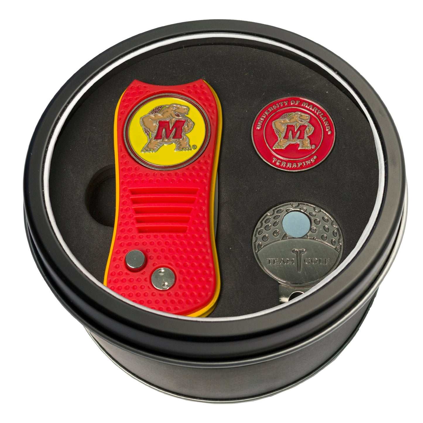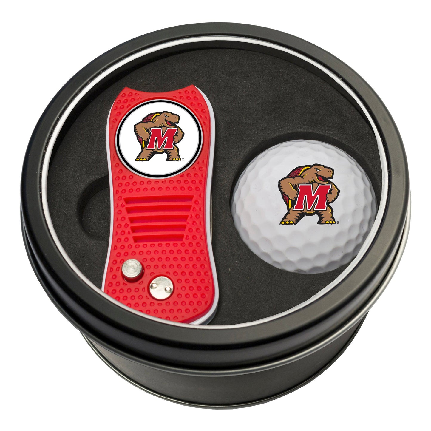 - Golf Ball Tin includes switchblade style retractable divot tool with double-sided magnetic ball marker, 1 logo golf ball