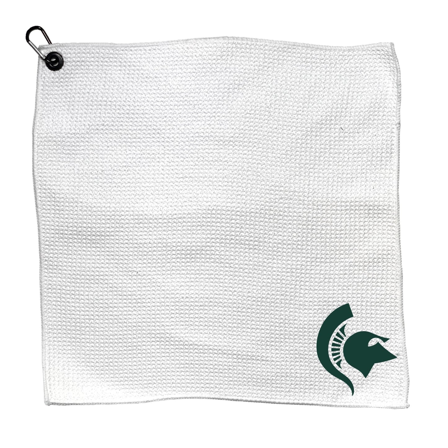 Microfiber 15X15" towel features handy carabiner for easy attachment and removal from golf bags and full color printed logo.