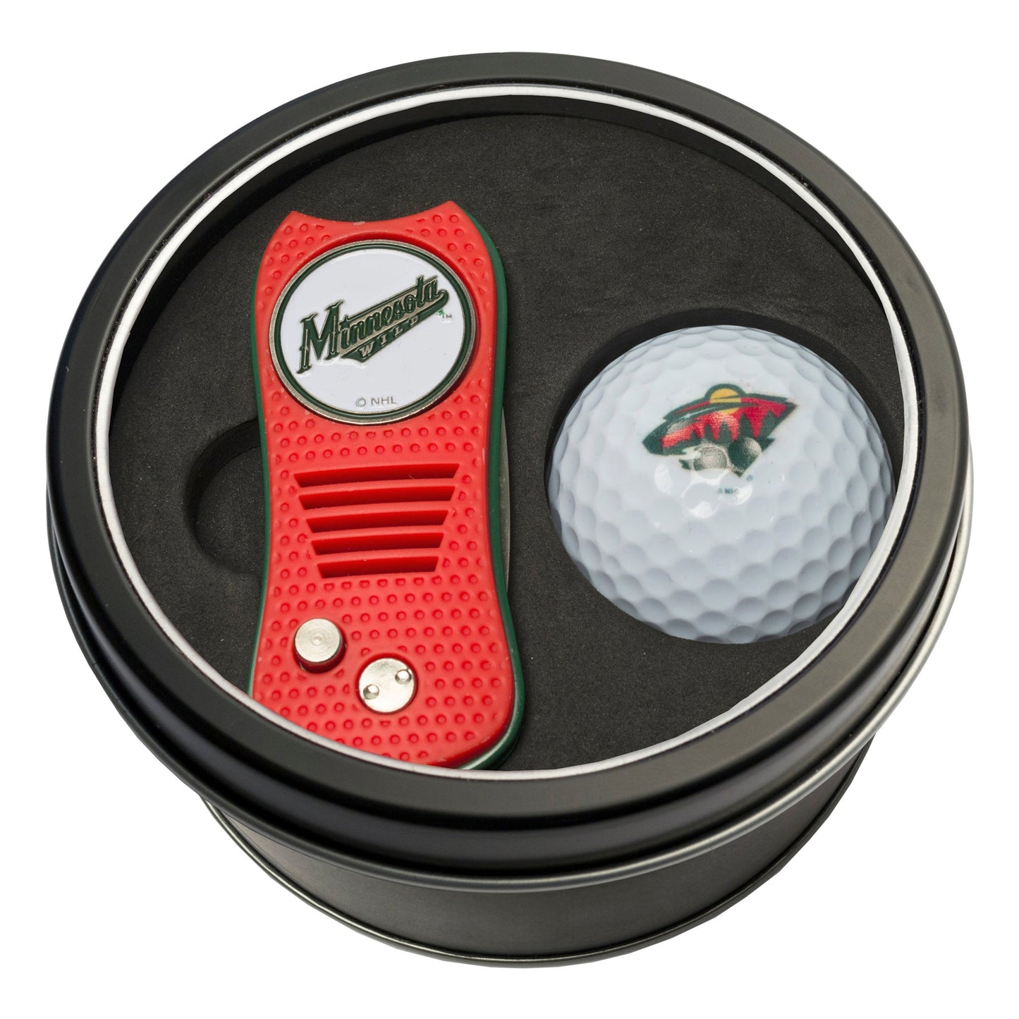 - Golf Ball Tin includes switchblade style retractable divot tool with double-sided magnetic ball marker, 1 logo golf ball