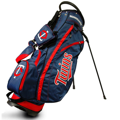 This stand bag features 14-way full length dividers, integrated top handle, & 2 lift assist handles, five zippered pockets, fleece lined valuable pouch, & cooler pocket, spring action stand, removable rain hood, umbrella holder, towel ring, & heavy duty nylon construction.