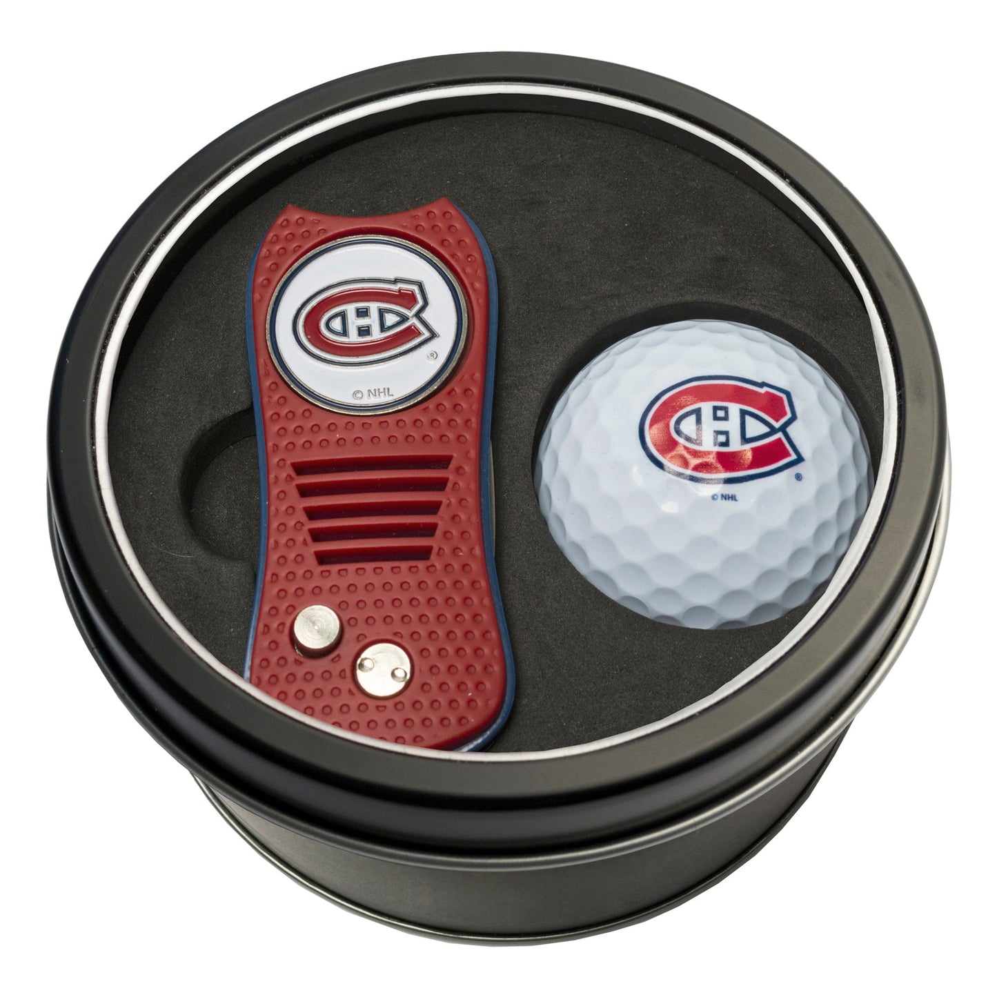 - Golf Ball Tin includes switchblade style retractable divot tool with double-sided magnetic ball marker, 1 logo golf ball