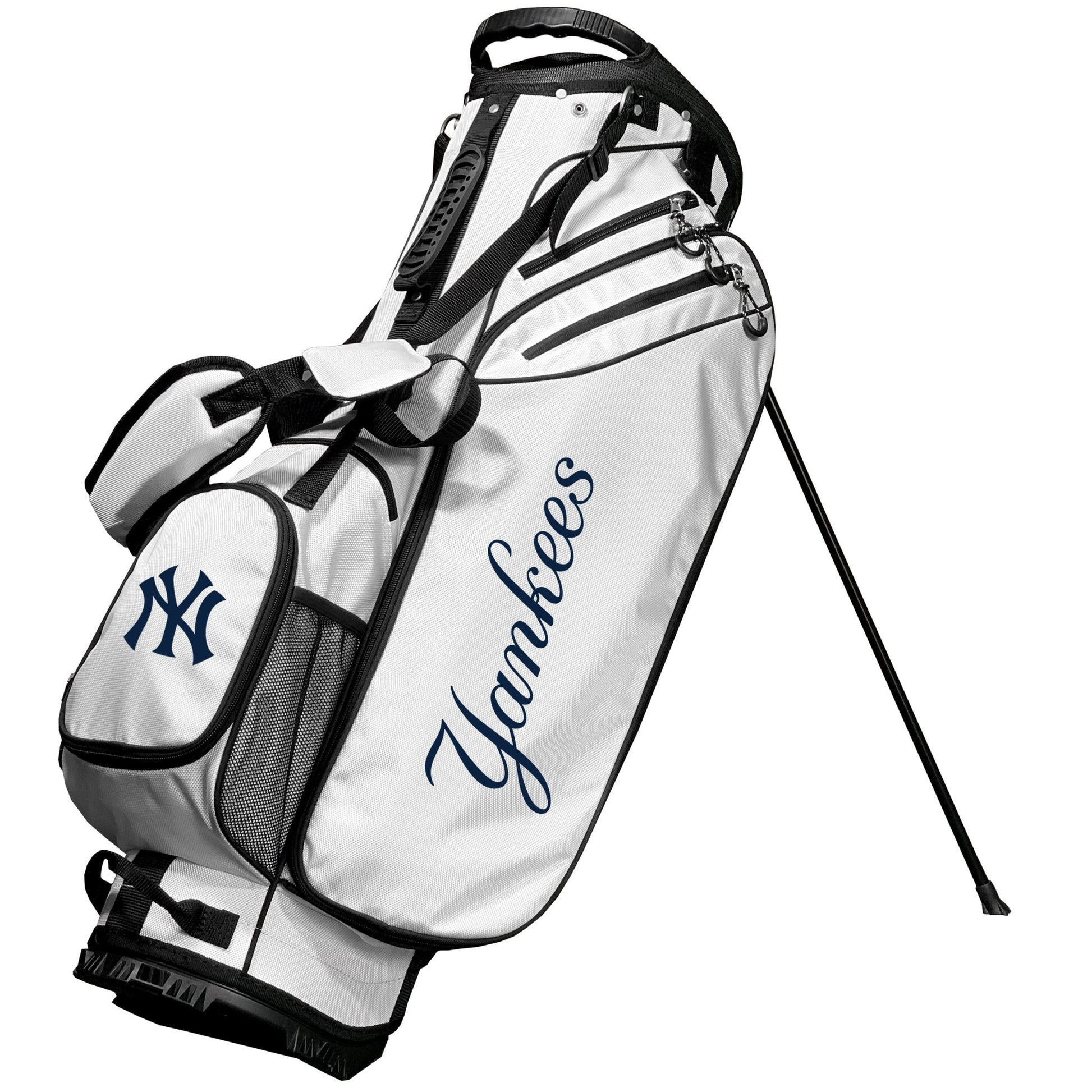 This stand bag features 14-way full length dividers, integrated top handle, & 2 lift assist handles, five zippered pockets, fleece lined valuable pouch, & cooler pocket, spring action stand, removable rain hood, umbrella holder, towel ring, & heavy duty nylon construction.