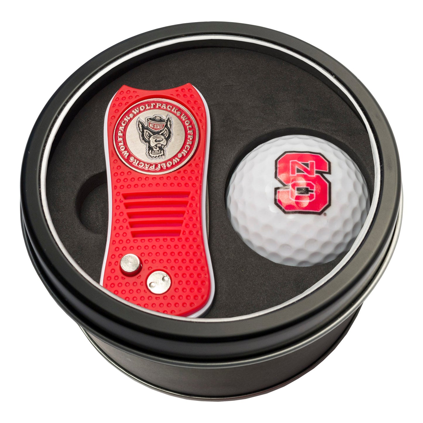 - Golf Ball Tin includes switchblade style retractable divot tool with double-sided magnetic ball marker, 1 logo golf ball