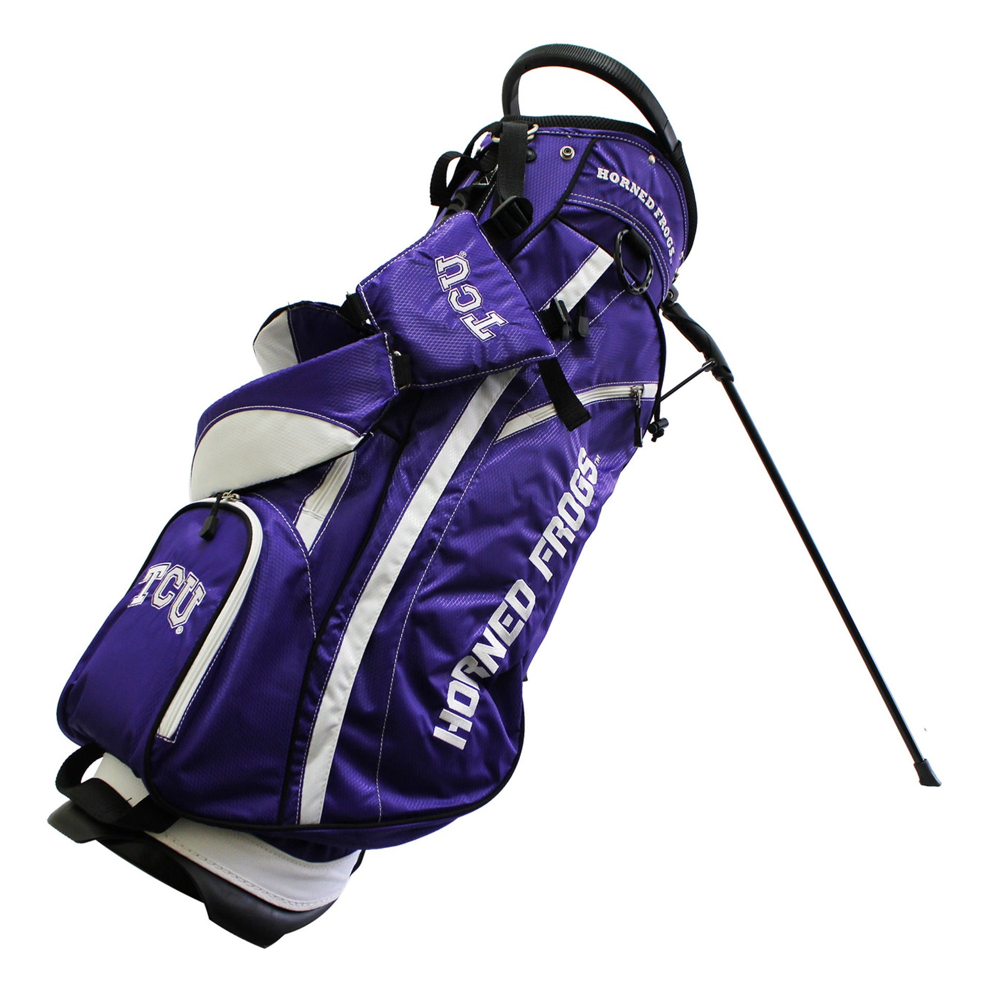 This stand bag features 14-way full length dividers, integrated top handle, & 2 lift assist handles, five zippered pockets, fleece lined valuable pouch, & cooler pocket, spring action stand, removable rain hood, umbrella holder, towel ring, & heavy duty nylon construction.