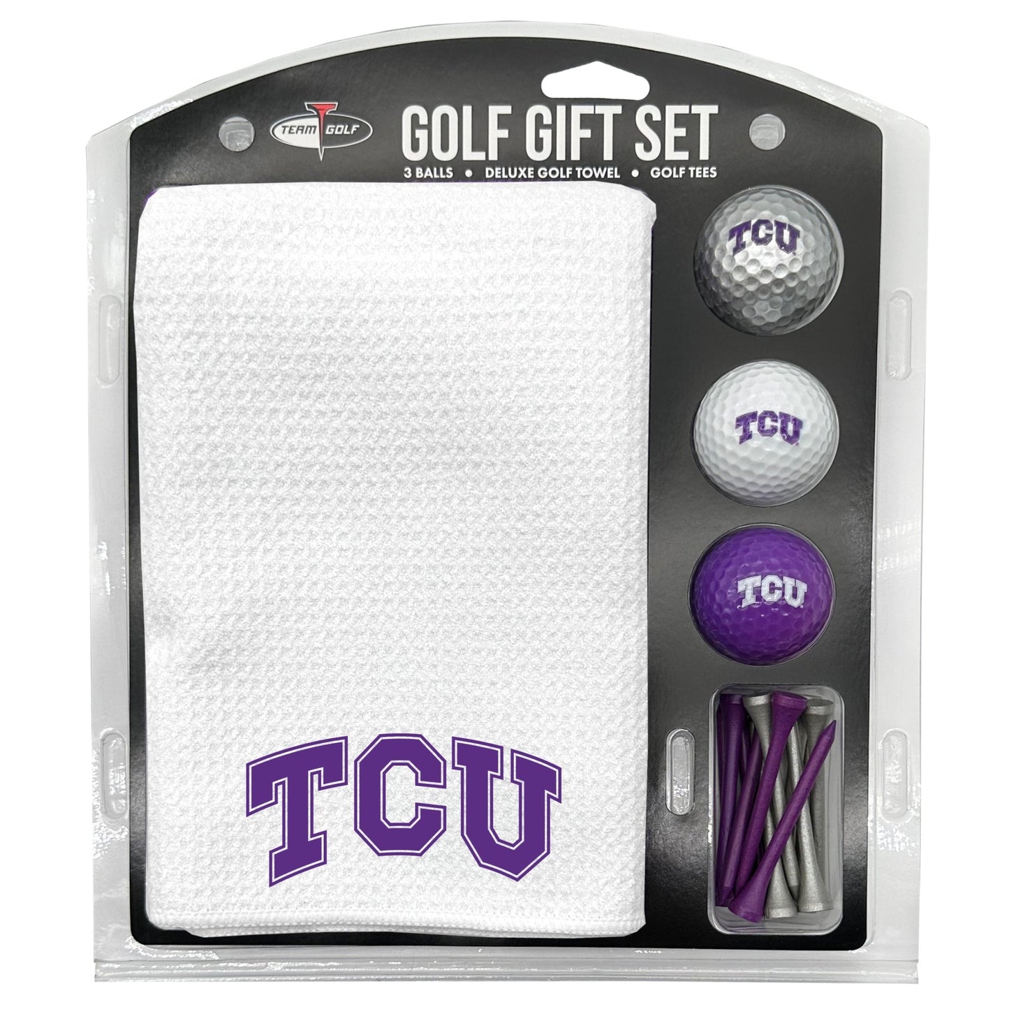 - Microfiber Towel Gift Set includes 16x40 microfiber towel (team color or white) with printed logo, 3 golf balls (colors may vary), and set of 10 tees