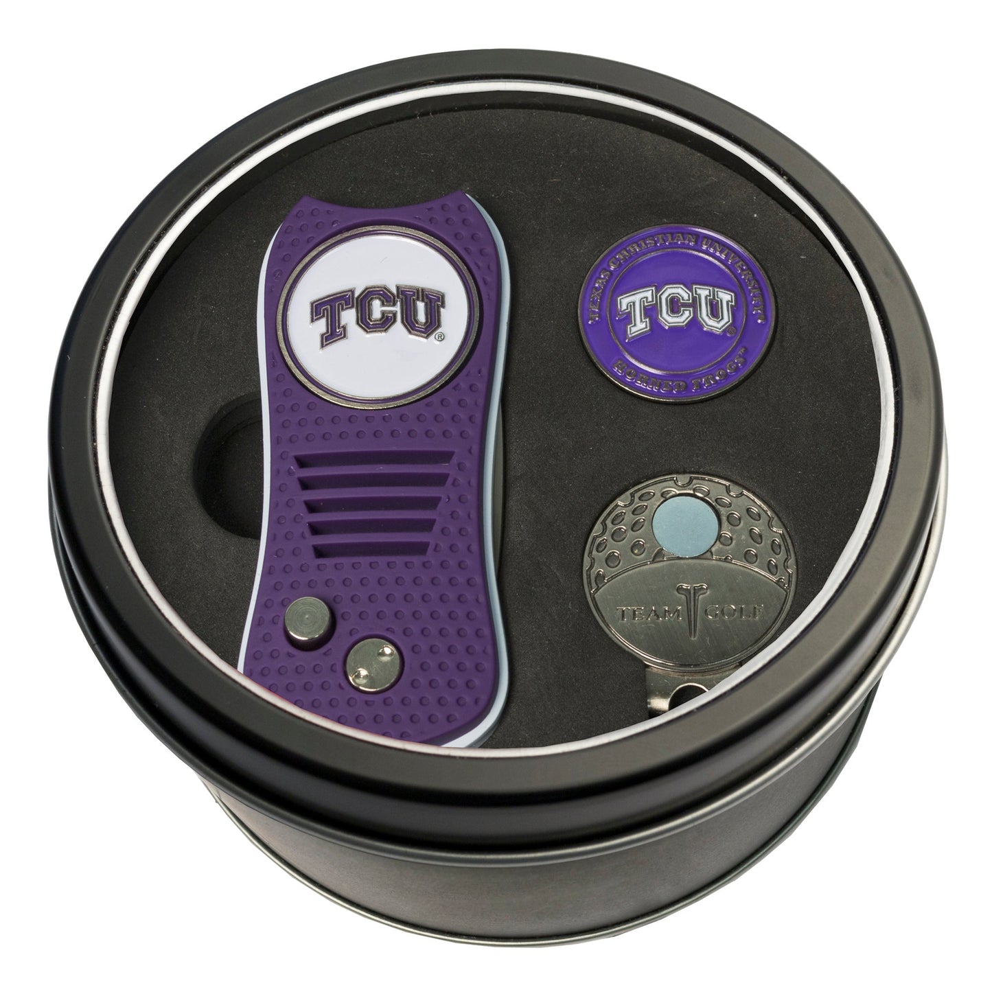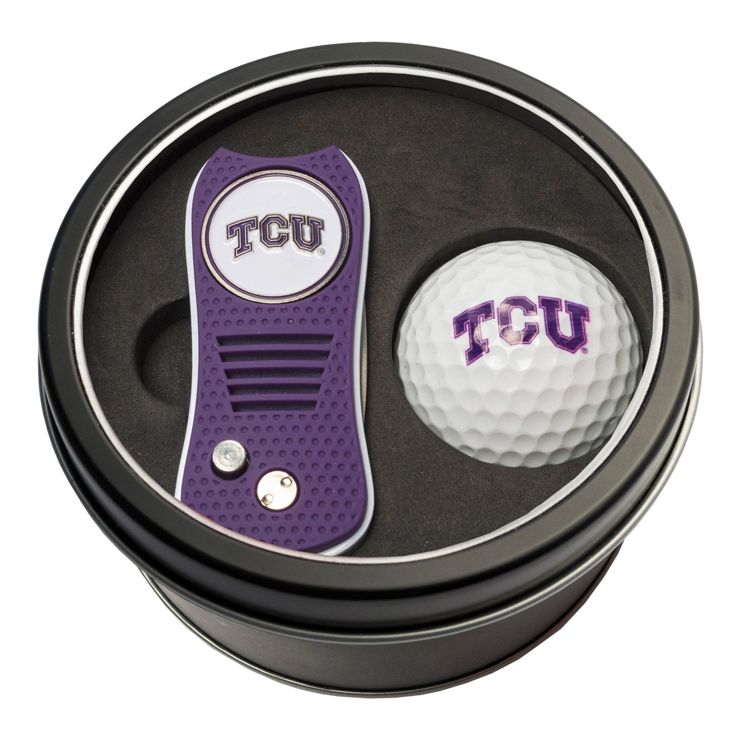 - Golf Ball Tin includes switchblade style retractable divot tool with double-sided magnetic ball marker, 1 logo golf ball