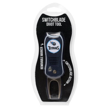 Switchblade Divot Tool features a unique and patented lightweight aluminum double prong design which causes less damage to greens, a soft grooved handle for easy gripping and a removable double-sided enamel fill ball marker.
