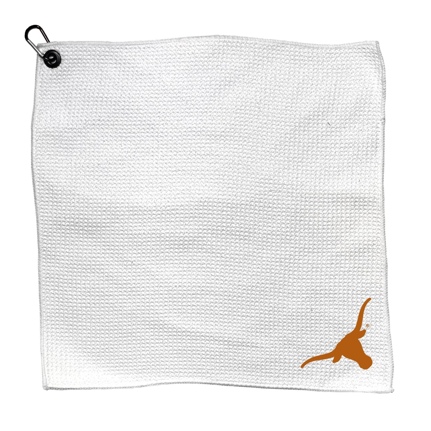Microfiber 15X15" towel features handy carabiner for easy attachment and removal from golf bags and full color printed logo.