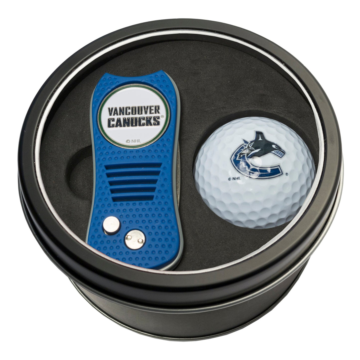 - Golf Ball Tin includes switchblade style retractable divot tool with double-sided magnetic ball marker, 1 logo golf ball