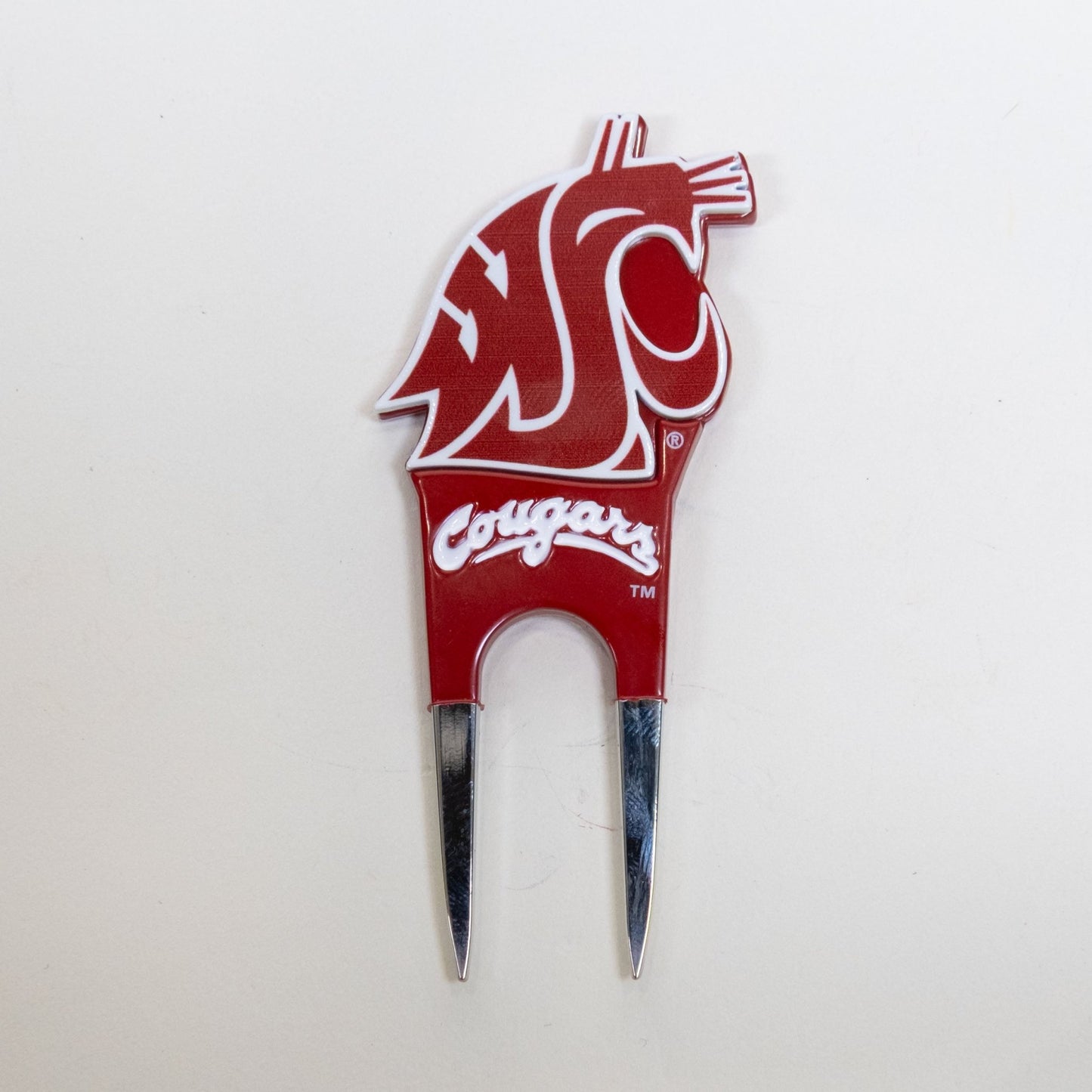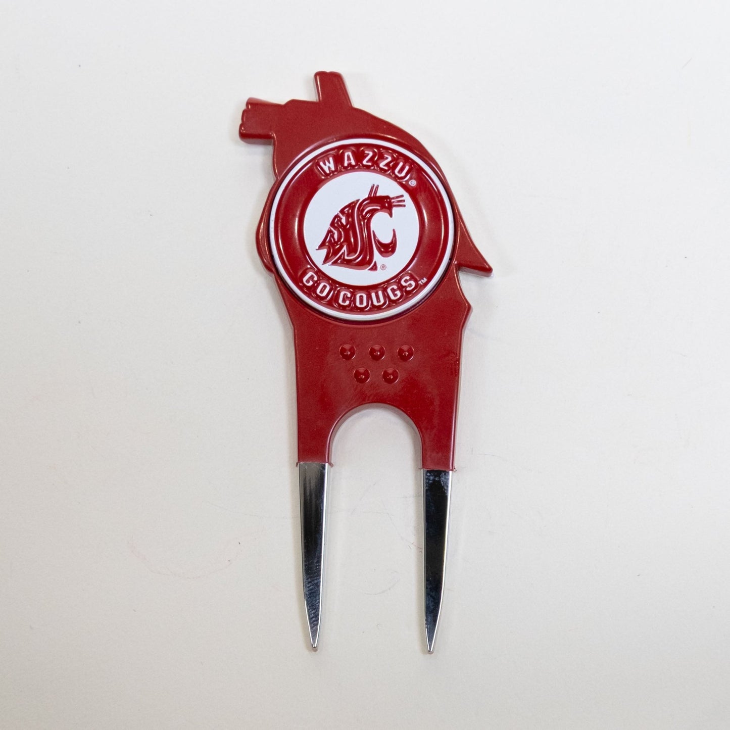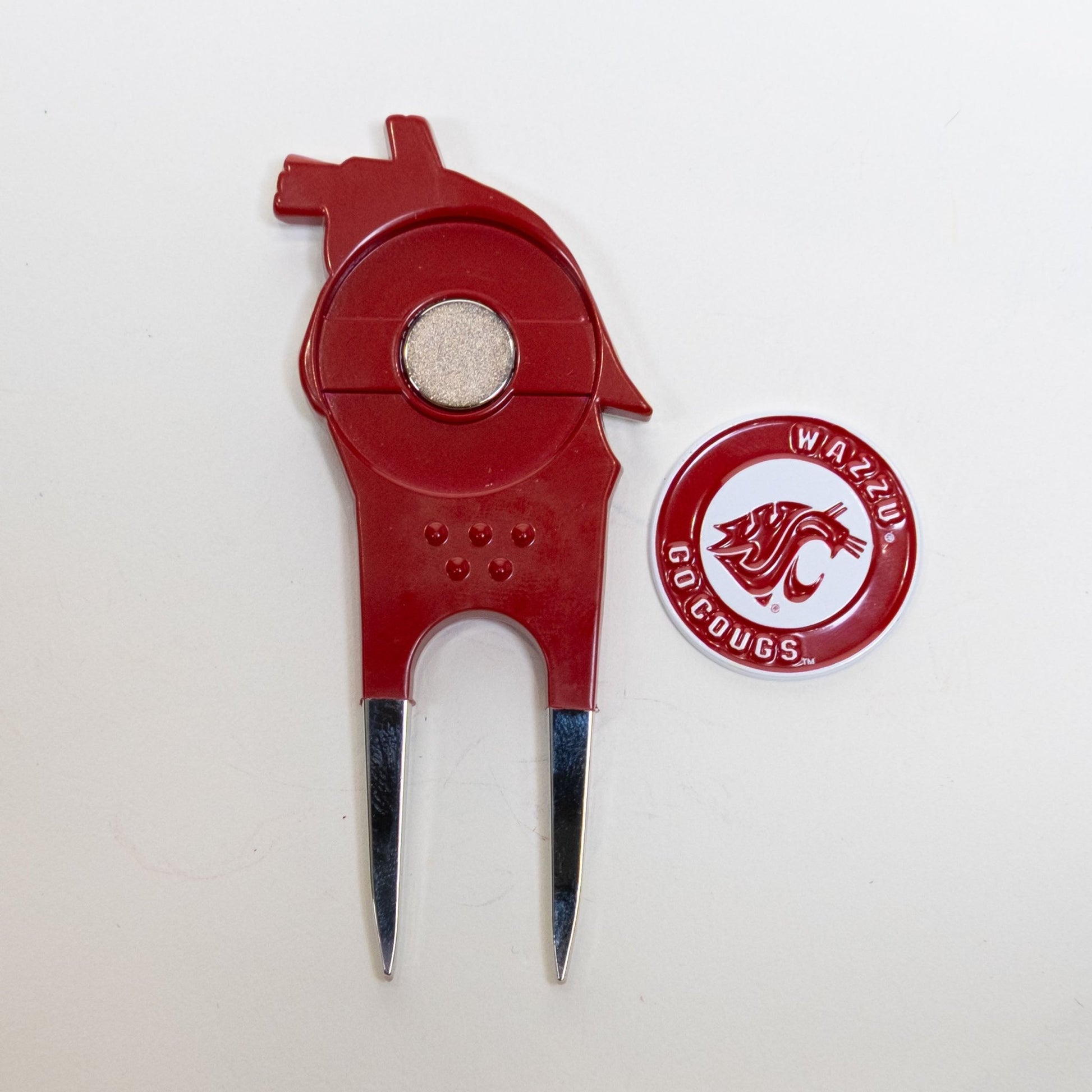 Switchblade Divot Tool features a unique and patented lightweight aluminum double prong design which causes less damage to greens, a soft grooved handle for easy gripping and a removable double-sided enamel fill ball marker.