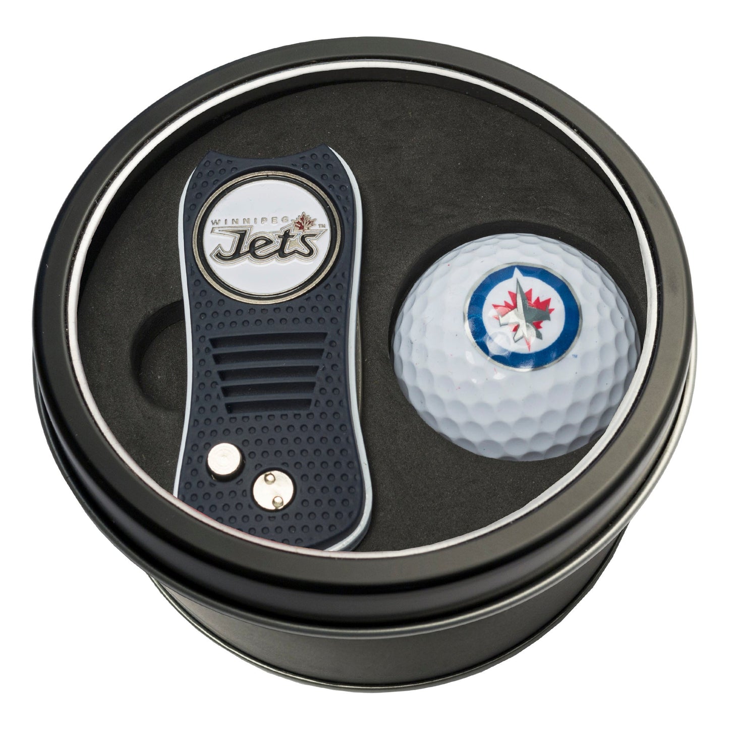 - Golf Ball Tin includes switchblade style retractable divot tool with double-sided magnetic ball marker, 1 logo golf ball